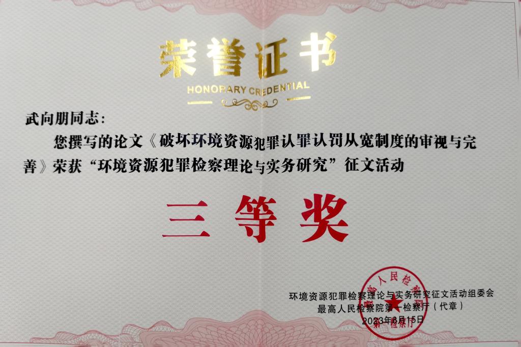 2023年4月,最高人民检察院第一检察厅、人民检察杂志社联合举办了“环境资源犯罪检察理论与实务研究征文”活动,共征集论文287篇。最终评选出一等奖6篇,二等奖15篇,三等奖20篇,优秀奖30篇。伟德国际官网武向朋副教授的论文“破坏环境资源犯罪认罪认罚从宽制度的审视与完善”获三等奖。