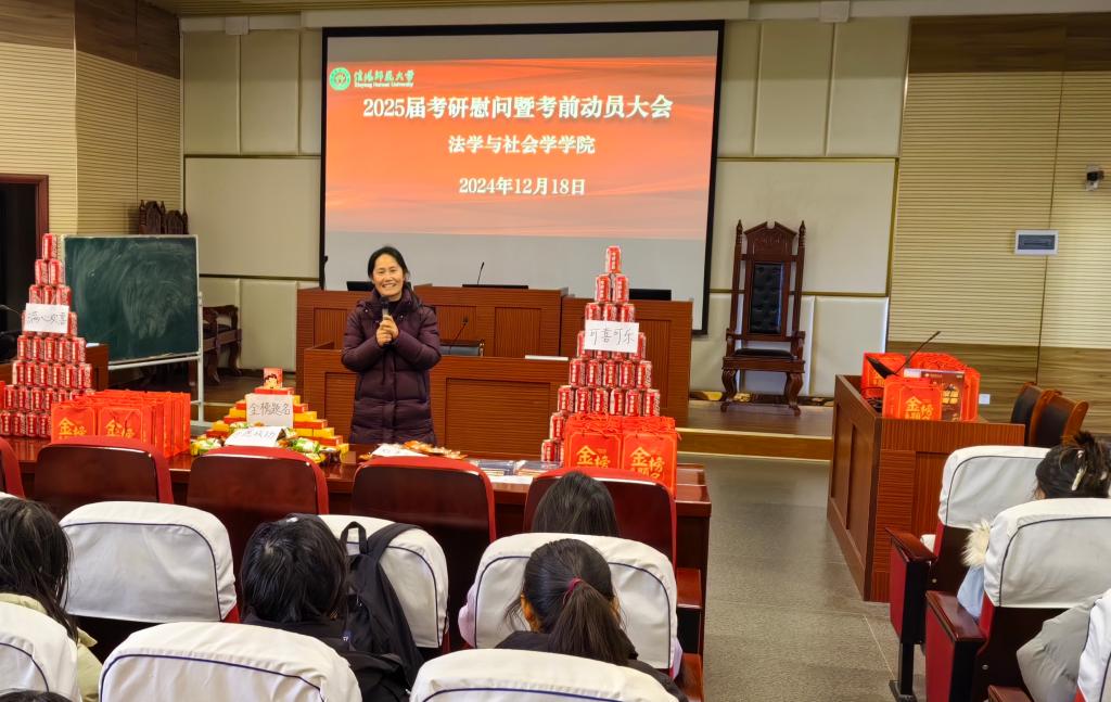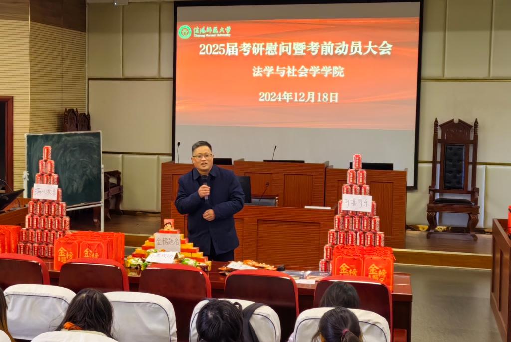 时间:2024-12-19 13:59 来源: 作者: 阅读: 次考研是一列星夜兼程开往春天的列车,其间有山重水复,终见柳暗花明。为缓解考研学子备考压力,鼓舞士气,坚定信心,12月18日上午,伟德国际1946源于英国在社科楼模拟法庭举行了2025届毕业生考研慰问暨考前动员大会。学院党委书记尚红林、院长古瑞华、副院长张玉鹏、副院长武向朋、副院长张宇、党委副书记刘雨亭及2021级全体学生参与本次活动。