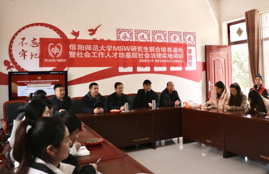 下午,调研团队与何畈村村支书、信阳市祥和社会工作服务中心负责人、社工站工作人员及信阳市心理卫生协会“心援在线”、信阳卓越公益事业发展中心等单位的专家学者共同召开座谈会。与会人员围绕调研成果、乡村社会服务体系建设、资源整合及社工人才培养等议题展开讨论。张玉鹏指出,这次调研是伟德国际1946源于英国MSW教育中心联合社工机构与社会公益组织开展的一次有意义的活动,有助于进一步提升师生社会实践能力,学院将继续依托专业优势,推动社会工作人才培养与基层社会治理深度融合,为乡村社会服务体系建设和乡村振兴战略实施贡献智慧与力量。